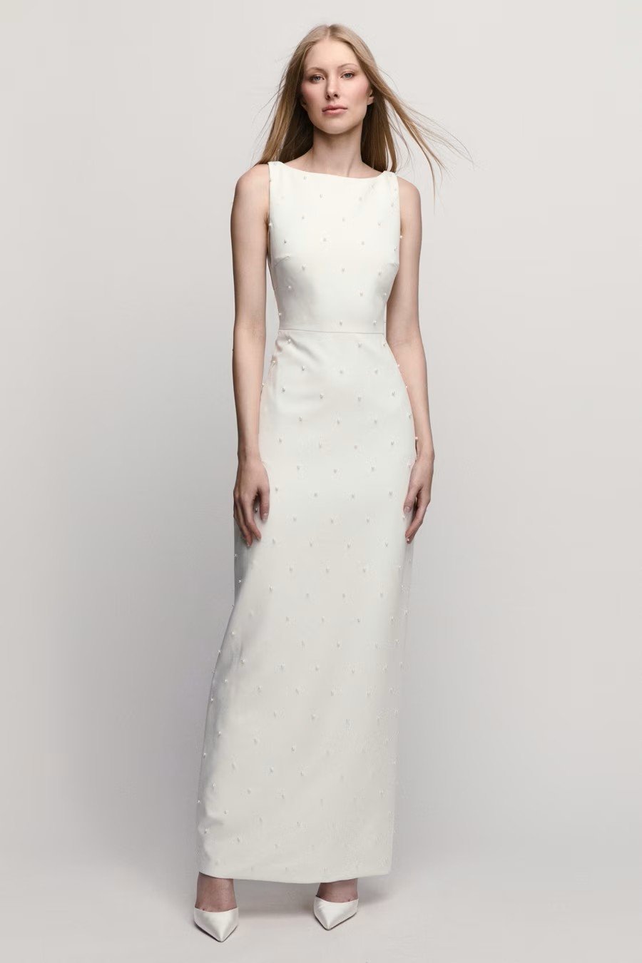 Maxi - length gown with a boat neckline and flattering waist seam, cut in crepe and studded with pearls from top to bottom
